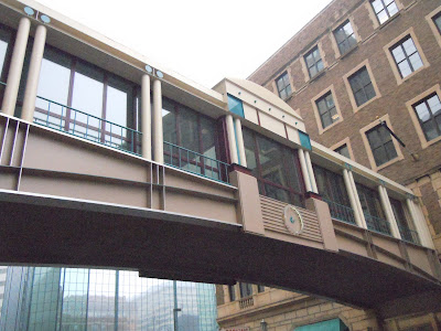 This beauty crosses 9th right next to the Medical Arts Building and Hell's Kitchen. It's from the doo-dad school of design. I will catalog all the schools of skyway design through the ages soon. Starting from the terrazo and steam-heat era of the 1960s through the airport inspired vacuity of the 1990s up to the most recent, and possibly last, bit of build up around St. Thomas. Many styles, but all damn sturdy, glassy and sober. Just like your aunt from Maple Grove.